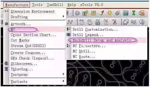2. Click in the menu: Manufacturing→NC→BackdrillSetupandAnalysis, as shown below:
