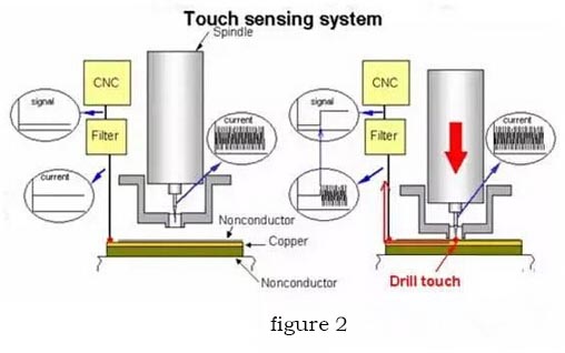 Relying on the micro-current generated when the drill tip touches the copper foil on the substrate surface to sense the height of the board surface when the drill is drilled down, then drill according to the set drill-down depth, and stop when the drill-down depth is reached. As shown in Figure 2, the schematic diagram of the work