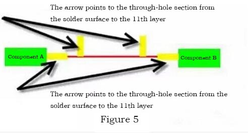 1. If the PCB board has signal lines on the 11th layer, there are through holes at both ends of the signal lines to connect to the component surface and the solder surface, and components will be inserted on the component surface, as shown in the figure below, that is to say , on this line, the transmission of the signal is from component A to component B through the signal line on the 11th layer.